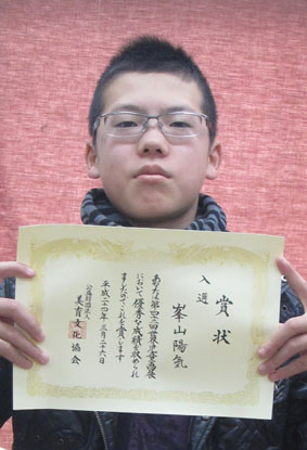 第34回未来の科学の夢交易社団法人発明協会・主催 文部科学省、経済産業省、特許庁、国立科学博物館、日本弁理士会、NHK、朝日新聞社、 西村行騎君が発明協会会長賞を受賞しました。一昨年も同じ賞を受賞、これで2度目の快挙です。 |