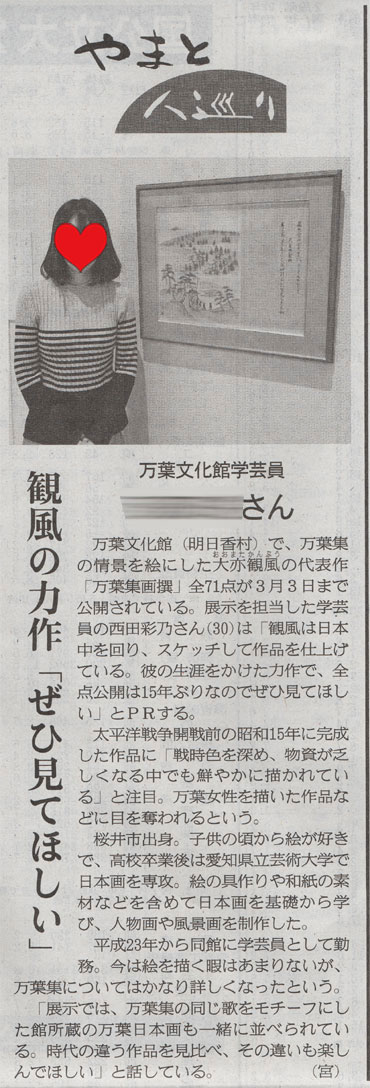 増田絵画教室の卒業生で、万葉文化館学芸員の西田彩乃さんの活躍が、産経新聞に大きく掲載されました。2019年2月7日